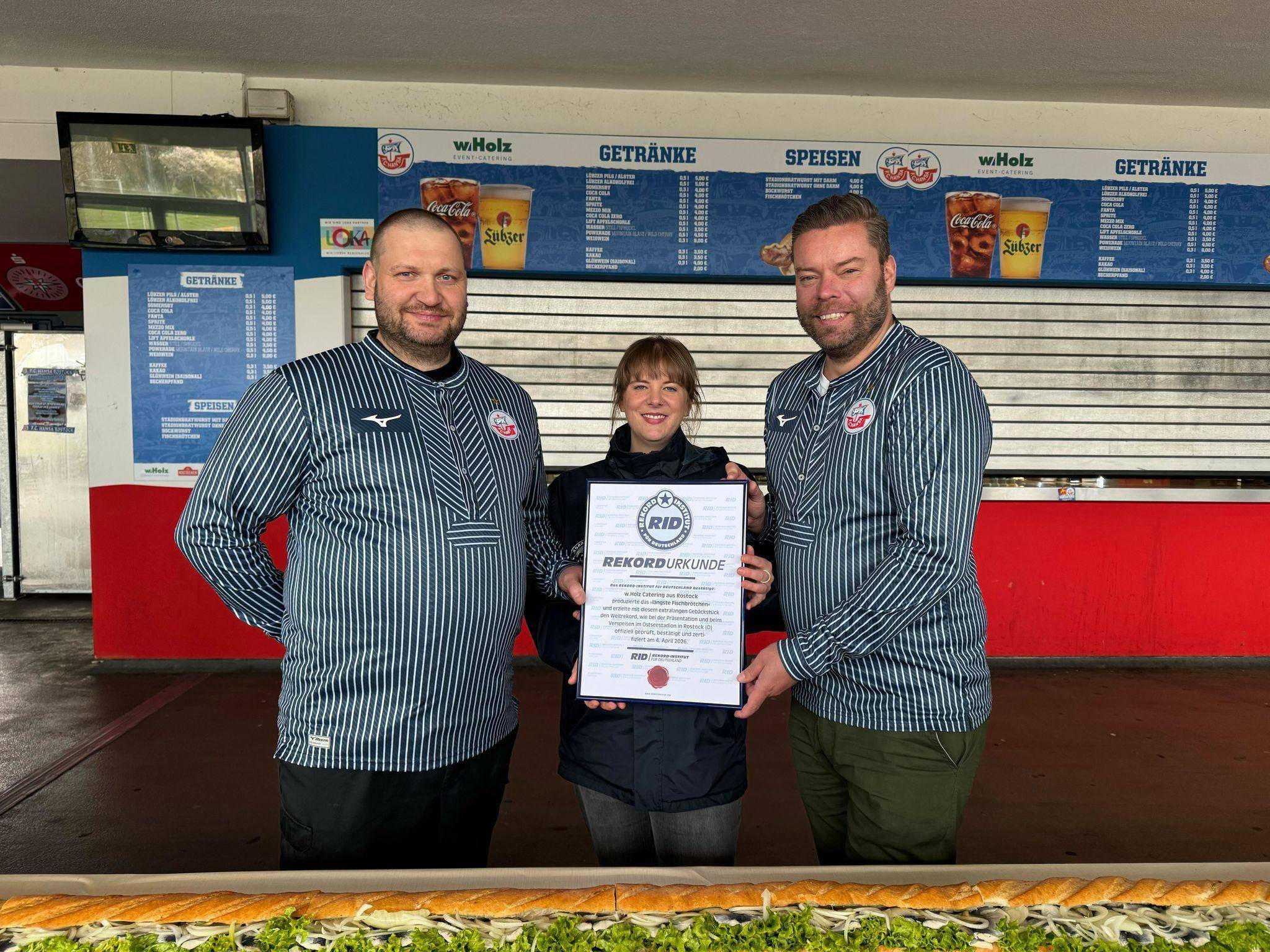 Das meterlange Brötchen war im Umlauf des Heim-Stadions des Fußball-Drittligisten FC Hansa Rostock aufgebaut worden – dort wo es auch sonst während der Fußballspiele Wurst, Brötchen und Getränke gibt. Um den Rekord zu schaffen, hatte das Catering-Unternehmen W.Holz eigenen Angaben zufolge zuvor 120 Kilogramm Hering bestellt.