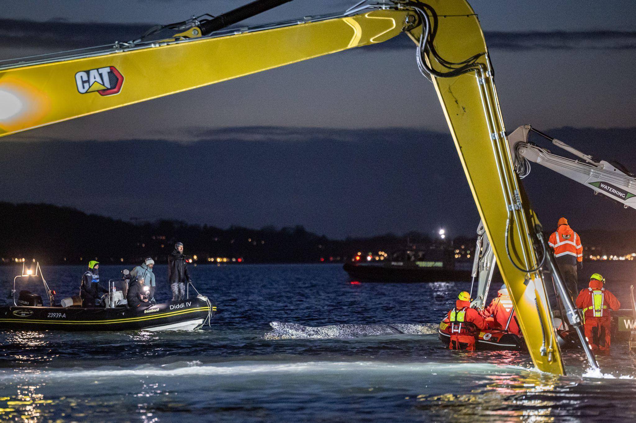 Meter um Meter hatte sich der Wal am Abend durch die Rinne gekämpft, die ein Schwimmbagger ausgehoben hatte. Auch ein größerer Bagger konnte schließlich von Land aus eingreifen, nachdem ein Damm aufgeschüttet worden war, um das schwere Gerät in Reichweite zu bringen.