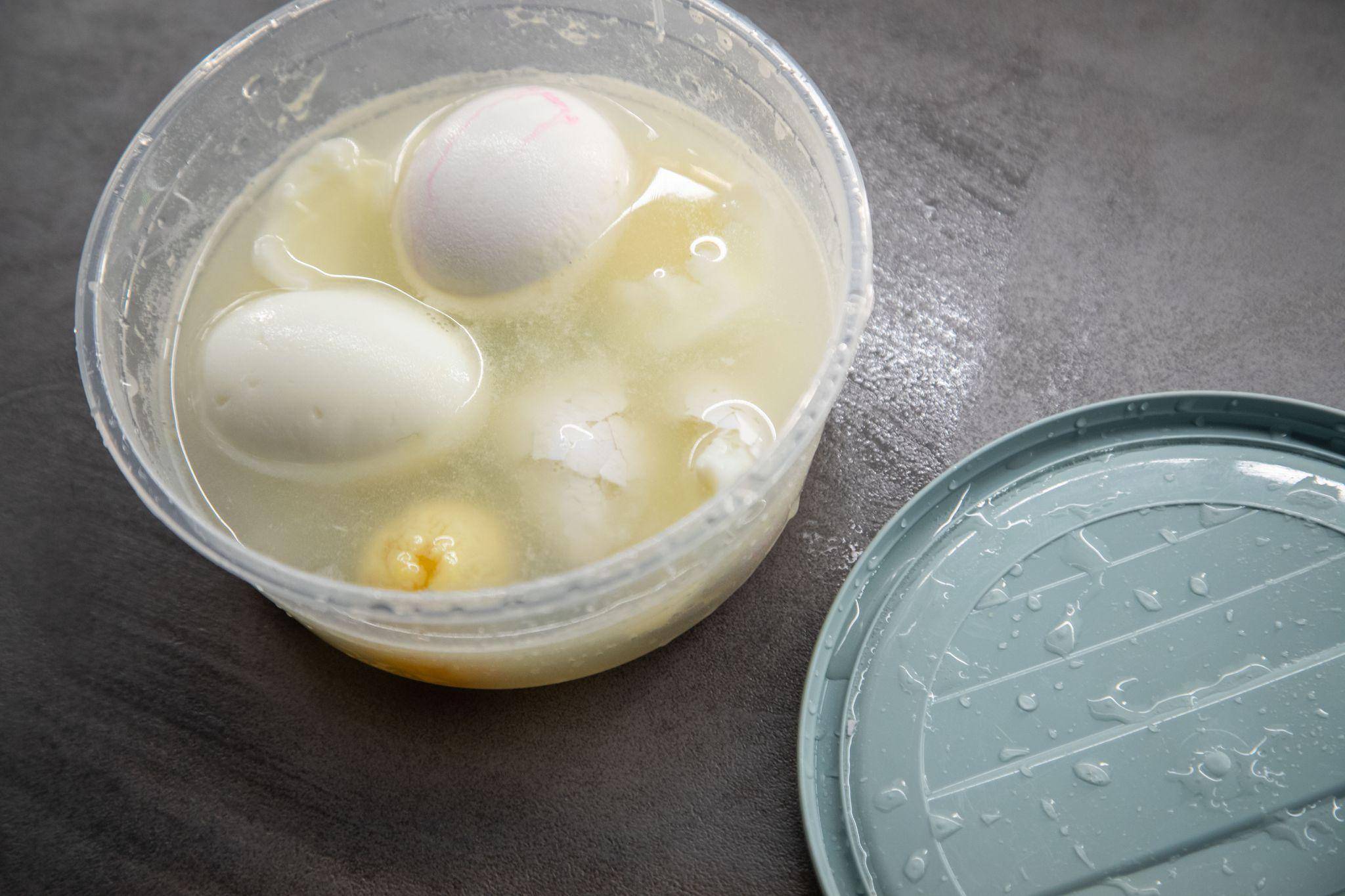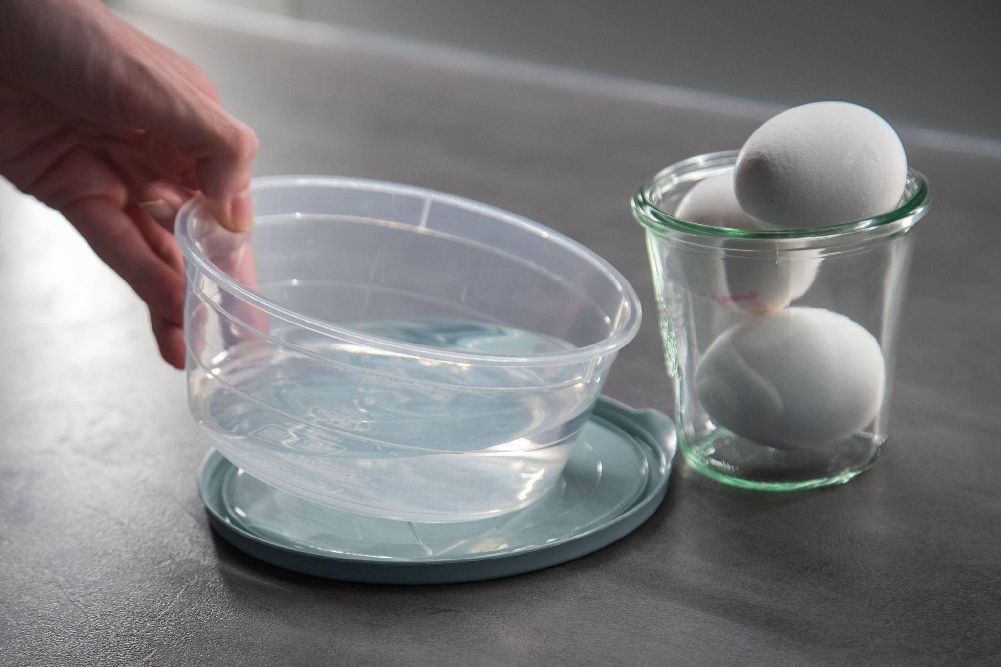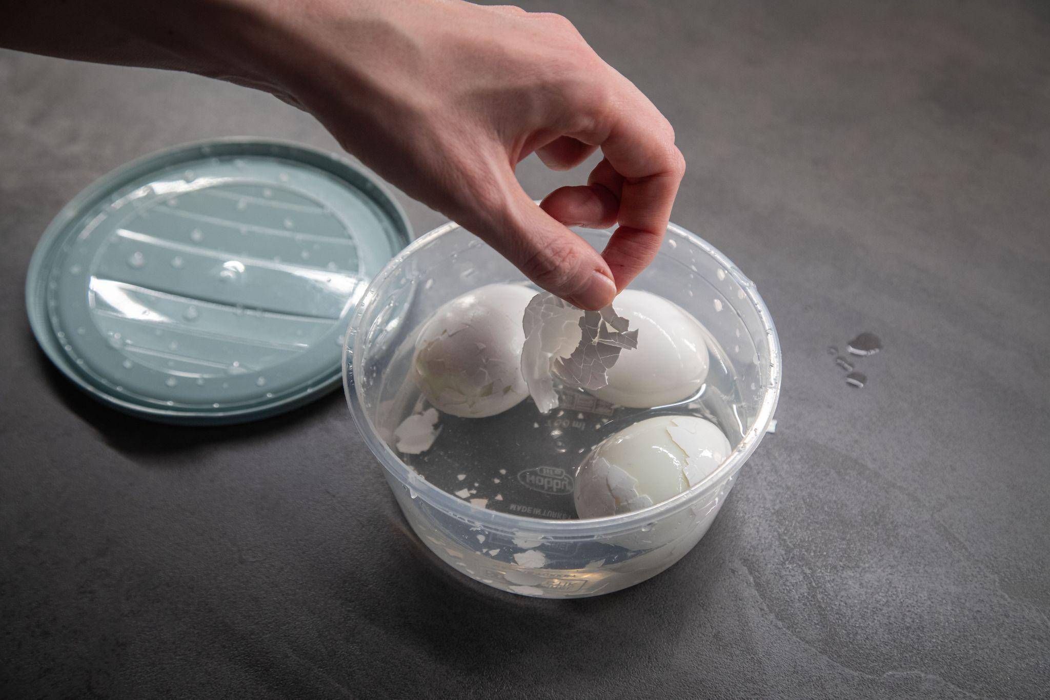 Und so geht`s: Ein Gefäß mit Deckel zu einem Viertel mit Wasser füllen. Nun die gekochten Eier hineinlegen, das Gefäß verschließen und einige Sekunden ordentlich schütteln. Den Vorgang gegebenenfalls wiederholen.